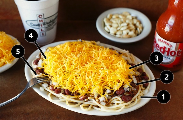 Eater Associate Editor Hillary Dixler provides a brief introduction to Cincinnati’s spaghetti/chili/cheese signature dish for (likely aghast) readers, including its origin story centered on Greek immigrants. She then has co-owner Maria Papakirk take us on a step-by-step tour of how to correctly build a five-way, with lots of photos.