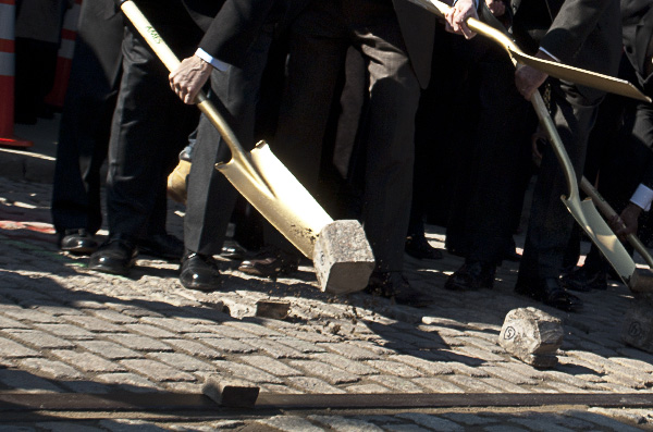 Last Friday bore witness to one of the most momentous groundbreakings in the modern history of Cincinnati. As an energized and enthusiastic crowd looked on, Mayor Mallory, U.S. Secretary of Transportation Ray LaHood and other assorted city dignitaries modeled their commemorative, gold spray-painted shovels and ill-fitting hardhats for the assembled media, all in a prelude to the groundbreaking ceremony for the Cincinnati streetcar.