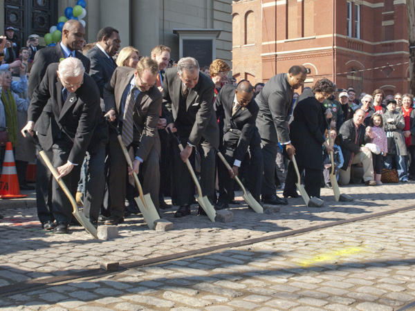 Last Friday bore witness to (pardon the giddy hyperbole) one of the most momentous groundbreakings in the modern history of Cincinnati. As an energized and enthusiastic crowd looked on, Mayor Mallory, U.S. Secretary of Transportation Ray LaHood and other assorted city dignitaries modeled their commemorative, gold spray-painted shovels and ill-fitting hardhats for the assembled media, all in a prelude to the groundbreaking ceremony for the Cincinnati streetcar.