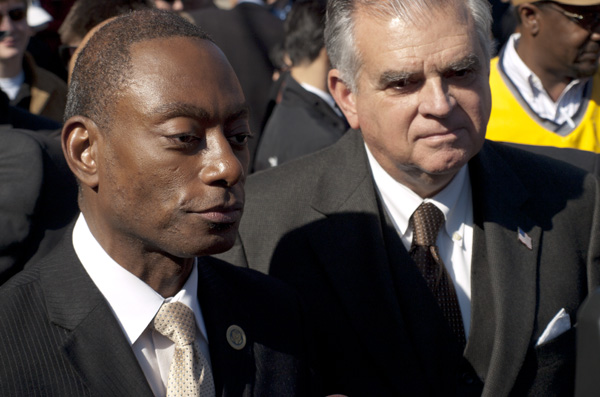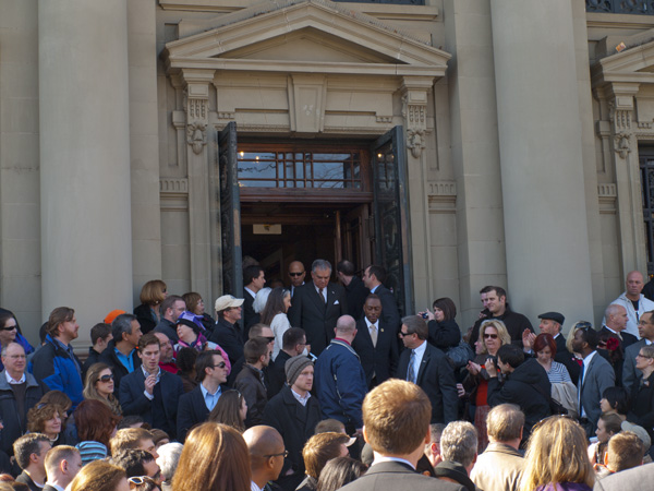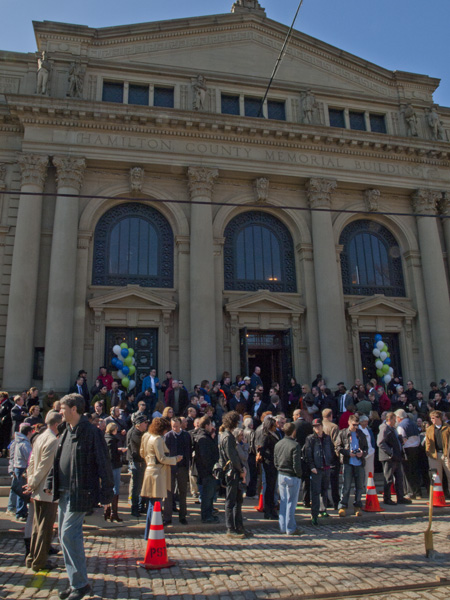 Supporters milled about both inside of and out front of Memorial Hill and on Elm Street, continually pinching themselves in one of those “is this really happening?” moments. Inside, a rapt house listened to speeches by, among others, Secretary LaHood, the mayor and “Mister Streetcar” (per the Mayor) John Schneider, all in an ascending prelude to the ceremony outside. The crowd inside was so packed in that at least another 200 or so waited outdoors.