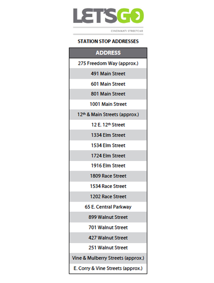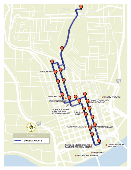 The City of Cincinnati is one step closer to beginning phase one of a streetcar system that will connect the Banks and downtown with Uptown and the University of Cincinnati. Locations of 21 stops along the 4.9 mile streetcar route have been determined and include ten stops in downtown, ten in Over-the-Rhine, and one in Uptown.