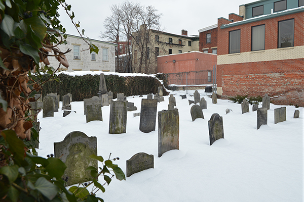 The compact space holds 85 tombstones, the most recent dating to 1849, when that year’s cholera epidemic put a squeeze on available plots.
