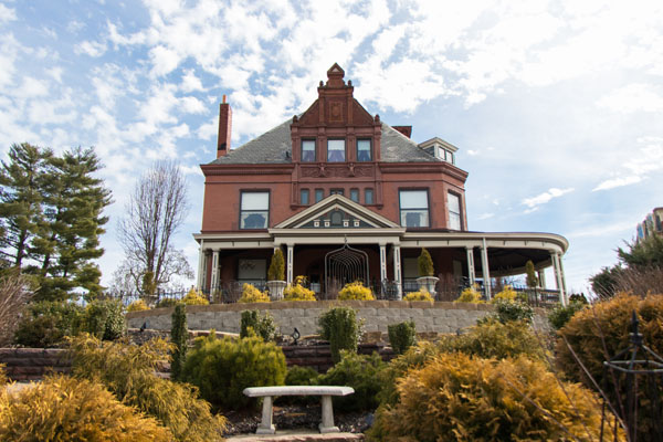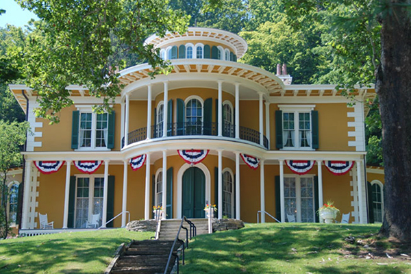 The home, a National Historic Landmark, features curved doors and windows leading out to large curved porches on each story, recalling the deck of a steamboat. The circular belvedere that sits atop the home references the pilothouse on a boat. Inside, a stunning flying staircase leads from the entrance hall to the second floor. After a stint as a VFW hall, Hillforest is now a museum.