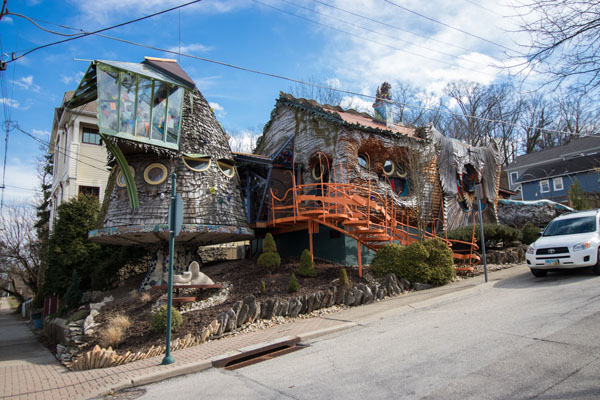 Architecture professor Terry Brown and his students built the house between 1992 and 2006. The curved wood shingles that give the home its fungal appearance are not uncommon on other area residences, notably on Observatory in Hyde Park and Clifton Ave near UC, but the abundance of them, in organic shapes, earned the Mushroom House its name.