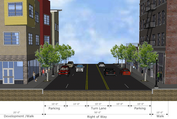 A different conceptual option — the “three-lane design” — drew plenty of support, too. That proposal envisions just one lane of moving traffic in either direction, plus a center turn lane; it would also have two curbside bike lanes buffered from two off-curb parking lanes. With all of those lanes, the overall roadway width would be 62 feet, but just 30 of it drivable — thus wider than the five-lane proposal.