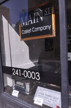 Main Street Caskets now offers Pet Caskets, hand made by a master carpenter in his Main St. shop behind the casket showroom. This winter he carried mopeds, which recently sold-out.