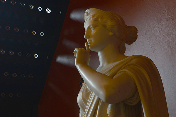 The wood floor gleams, complementing the ceiling’s white globe lights, the white support columns and the collection of white plaster portrait busts of historical figures that stand on prominent brackets.