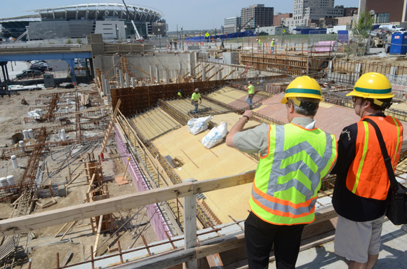 As we donned our attractively stylish yellow safety helmets and green vests at the corner of Mehring and Main, it was already evident how much had been accomplished. The newly configured Mehring Way is integrated seamlessly into the park and its new route arcs to the North while dipping discretely under the Roebling Suspension Bridge. Following there we climbed the steps to the site of the Moerlein Lager House. After sitting dormant for a rather lengthy period of time, it was good to see construction of the Lager House finally under way. Indeed, even the outline of the “Moer to Go” carryout window was evident on the West wall near the future location of the Moerlein Biergarten.