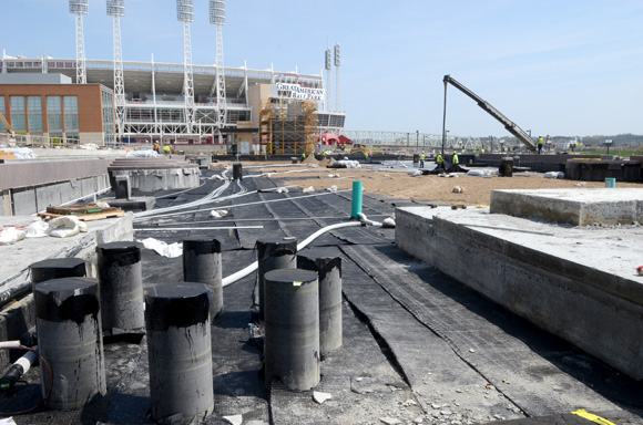 Perhaps initially overlooked in the monolithic hubbub that is the Banks Project, not to mention the full-throated mania directed at the Reds games at nearby Great American Ball Park, is that CRP’s Phase 1 is moving at breakneck speed in order to have the Schmidlapp Event Lawn open and ready to go for planned events on May 24 and 25. We were recently privy to a tour of the site from the obviously knowledgeable and erudite project manager, Dave Prather. It’s truly amazing what they have been able to accomplish on a site which was essentially a barren and desolate mud pit just a short time ago.