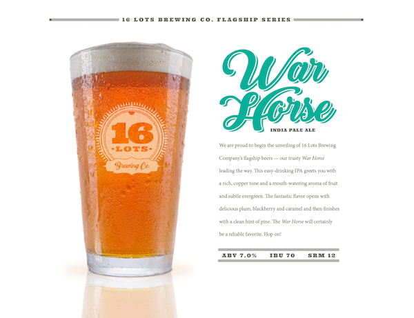16 Lots will emphasize a “focus on style,” and will feature six beers that will rotate seasonally. Although the brewery hasn’t officially opened, it has already released its Warhorse IPA and will follow that soon with its Muddy Creek Oatmeal Stout.