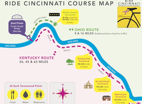 Race day begins at 6:30 a.m. with the 63-mile ride. The 45-mile ride begins at 7 a.m., the 26-mile at 8 a.m. and the 8- and 16-mile rides at 8:30 a.m. Event registration is $40 for adults and $15 for kids 12 and under. All who sign up to ride get a Ride Cincinnati T-shirt, and participants who raise at least $100 in pledges receive a bicycling jersey.