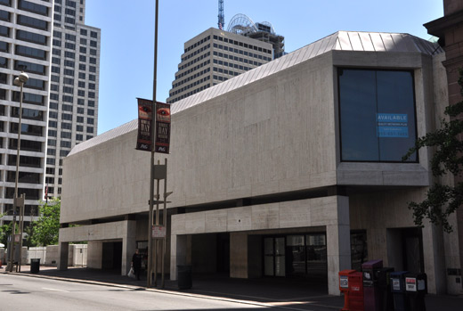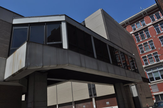 Skywalks. In the late 1950’s, wunderkind urban planners came up with a series of proposals to ease the impending downtown conflict between plebian pedestrians and their auto-overlords. One of these was a network of second story skywalks. While the original plan also included such familiar urban planning failures of the 1970’s such as pedestrian urban malls, arcades and subterranean walkways, the skywalks were the only ones to see the light of day. Opening in 1971, the city ultimately constructed 21 sections at a cost of $16 million– although the toll on the urban streetscape was far greater. By removing the pedestrians and abdicating the ground floor to cars and streets, foot traffic….the lifeblood of any urban core….seemingly dissipated. Street level merchants lost business as shoppers were sucked up into the second floor corridors, like hamsters in their $16 million urban habitrail tubes.