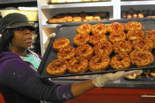 Spots highlighted include Holtman’s Donuts (the story features a photo of staffer DeShawn Ashley holding a tray of donuts), The Eagle, Pontiac BBQ, Quan Hapa, Graeter’s and Findlay Market.
