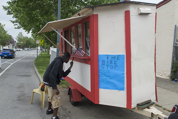 Now featuring a ’49 Desoto, the hand-written sign announcing “THE BIKE STOP” features such amenities as free air, tire patches, water, bike parts and discounted Reds tickets. They were also offering little lemonade powder packets to put in your water if you so desire.