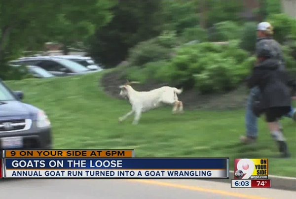 The inaugural “Running of the Goats” was planned May 7 to celebrate the season’s first Covington Farmers Market, with the city’s Goebel Goats parading from their pen at Goebel Park in MainStrasse to the market at Third and Court streets in the middle of downtown Covington. Except the goats had other ideas and immediately scattered in multiple directions.