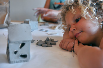 Indeed, passers-by who walk by the Happen Inc. studio at the north end of Northside’s business district will see participants of all ages working on art projects, in disciplines from pottery to sculpture and fashion-design. Per Happen Inc.’s guidelines, the studio is not a place for children to simply be dropped off, or for parents to sit by idly, while their young charges work. Instead, intending to “ignite the creative energy between you and a special child,” Happen Inc., requires grown-up involvement and stresses a more “plugged-in” experience by logging only visitors who spend a minimum of thirty minutes working in the space. And while the organization preaches involvement, it also strives to inspire it with a unique character-driven approach to teaching their classes (which run from Tuesday through Thursday, in addition to special events and open studio time on Saturday).