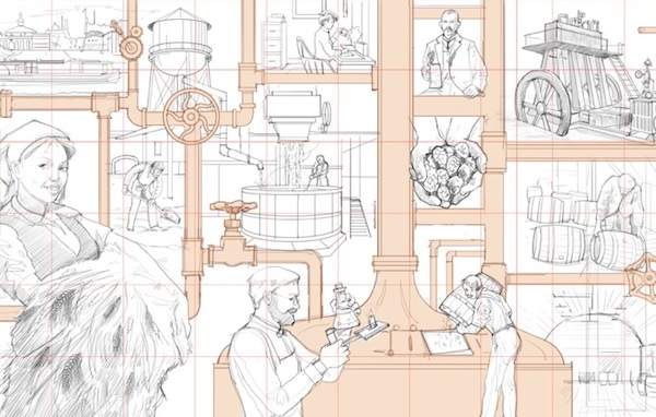 Provided – Initial concept drawing for one of the new brewery-themed murals