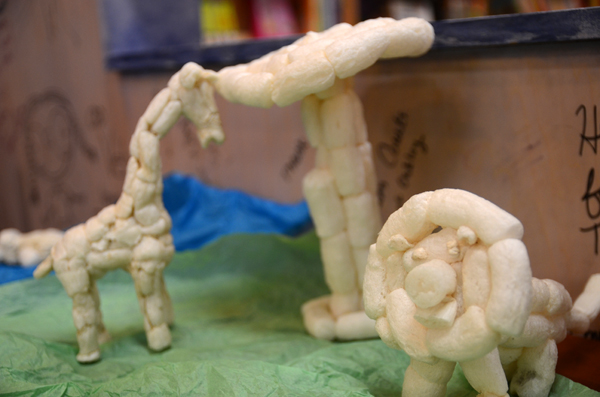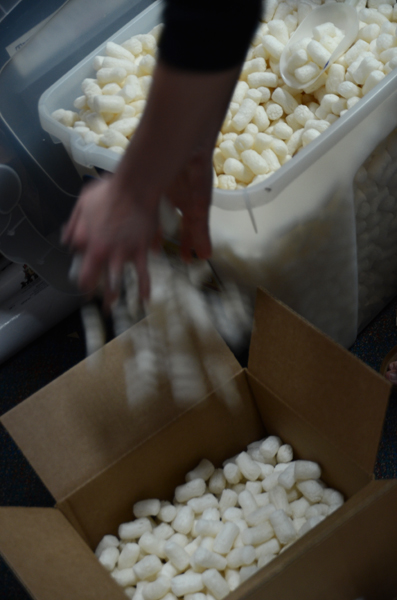 All of the materials that are used to build the box are bought from regional companies. The tape, which does not contain fiberglass, comes from a West Chester company; the boxes are from a shipping company in Roselawn; the corn-based (edible – but not very tasty) packing peanuts are from a company called Puffy Stuff in Louisville and the blue crinkle paper comes from a company in Nashville.