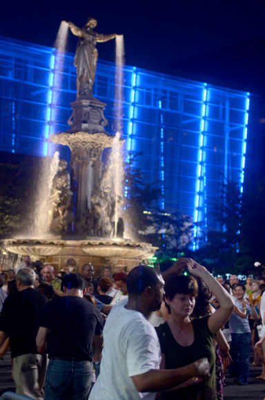 On steamy Thursday nights during summer, revelers spin, strut and sweat their way across Fountain Square to the lively rhythms of a dance form that heralds a sea change rippling through America. Courtesy of Cuba and Puerto Rico, salsa is one of many reminders that the US is becoming increasingly influenced by our neighbors to the south.
