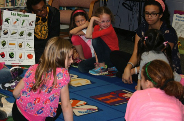 On a recent afternoon, service-learning students Andre Crumpton and Alexis Shelton sat cross-legged on a colorful carpet. The rug, checkered with the letters of the alphabet, was at the center of the elementary school’s library. Crumpton peeked above a laminated poster titled “Les legúmes.”