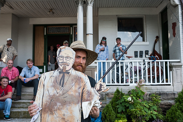 Economic restructuring, or fostering the growth of new businesses, is high on the priority list for Katie Meyer, Covington’s 29-year-old Renaissance manager. Three years into a job in the town where she grew up, Meyer sees signs of success in the 15 new businesses that have opened in the city since January—retail and restaurant and gallery spaces that have taken up once-vacant spots. She’s the force behind “Make Covington Pop,” a community effort to support new small businesses and build excitement around the city by creating pop-up shops, or temporary business and event spaces, in unoccupied storefronts. The initiative launched last Black Friday (the day after Thanksgiving) with the opening of two pop-ups on Pike Street—one bookstore/coffee shop and one vintage clothing operation that has since evolved into District 78. This week, Make Covington Pop hosts “Big Talk Small Talk, a Syposium on Pop-Up Shops and Urban Vitality,” in an effort to keep the momentum going. The power of the pop-up, according to one guest speaker, is in its ability to build community. “You start turning places into destinations,” says Griffin VanMeter a Kick Ass Kentuckian of Kentucky for Kentucky, based out of Lexington. “You get people experiencing culture together. Kentucky for Kentucky has been successful at that. We get our fans and supporters to come out, and they see things they wouldn’t already see.” Joining VanMeter in Covington this week are Lisa Frisch of the Portland (Oregon) Business Alliance, who has supported a range of pop-ups in Portland since 2009; and Michael Forsythe of Detroit’s pop-up initiative, RevolveDetroit. Though the number of vacant storefronts in Covington has declined this year, Meyer can point to several spaces nearly move-in ready and others that need a boost from building owners to make them appealing investments for budding entrepreneurs. The symposium offers information designed to engage property owners as well as potential business owners, Meyer says. If entrepreneurs get a healthy start in Covington, they may, like District 78, decide to make a more permanent investment and stay. “We do want to do another round of pop up shops this fall,” Meyer says. “It’s all about continuing the movement.” Interested in finding out more about "Make Covington Pop"? Find the group on Facebook or register for this week’s symposium. By Elissa Yancey Follow Elissa on Twitter. Photos of a recent pop-up event in Lexington hosted by Kentucky for Kentucky: The Mounting of the Colonel, a celebration of the installation of a Colonel Sanders weather vane on a newly restored event space. Photos by Frank Döring.