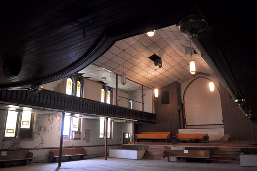 At first, Sauer says, the plan was to only choose Over-the-Rhine buildings north of Liberty, figuring that 3CDC didn’t need much help in its target area. “But they said, ‘We’re happy to have you,'” she says. So one in Washington Park was also selected. The building picked to study in that area, the old St. John’s Unitarian Church, could use the help. Built in 1868 for the city’s first congregation of German Protestants, who used it until 1946, it now suffers from disuse and wear-and-tear. But its glorious Gothic architecture and stained-glass windows shine through the grit, especially where the interior drop-ceiling has been removed to reveal the well-crafted structural details.