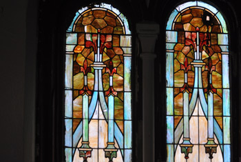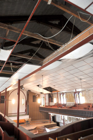 At first, Sauer says, the plan was to only choose Over-the-Rhine buildings north of Liberty, figuring that 3CDC didn’t need much help in its target area. “But they said, ‘We’re happy to have you,'” she says. So one in Washington Park was also selected. The building picked to study in that area, the old St. John’s Unitarian Church, could use the help. Built in 1868 for the city’s first congregation of German Protestants, who used it until 1946, it now suffers from disuse and wear-and-tear. But its glorious Gothic architecture and stained-glass windows shine through the grit, especially where the interior drop-ceiling has been removed to reveal the well-crafted structural details.