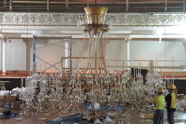 Provided – Workers reinstall a crystal chandelier following Springer Auditorium restoration.