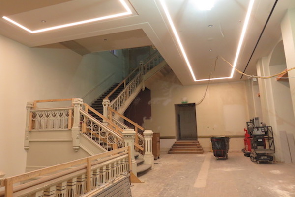 Three arched semicircular windows below the building’s memorable rose window now have had tracery — lacy metal patterns, recreated from Samuel Hannaford’s original architectural drawings. Thirty art-carved, cherry wood panels that formerly graced a historic organ installed on Music Hall’s stage in 1878 have been reacquired and will become a museum-quality display for the Taft Suite, a new donor lounge. Three crystal chandeliers that previously graced the main lobby will provide illumination.