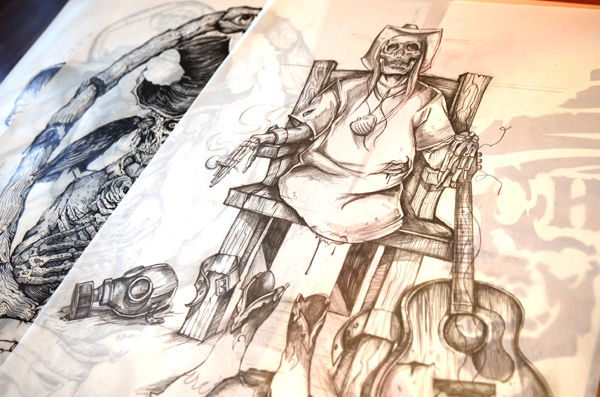 On the table there’s a preliminary sketch for a new Justin Townes Earle poster, with Earle’s head peeking out of a cannon that’s sitting atop a skateboard.