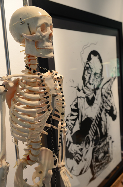 A miniature skeleton hangs from a stand on one side of a drawing table in Keith Neltner’s Camp Springs studio. Nearby sits a mostly empty bottle of Jack Daniels. In between them, a smoke-breathing guitar-player lunges from a framed print that leans against the wall.
