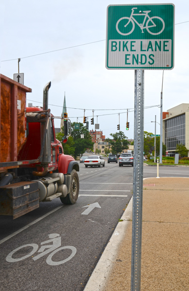 • Change lanes to pass: Don’t skim by a bicycle, leaving only a few inches for error. We may have to swerve to avoid debris or potholes. (Cincinnati was the first city in the country to install signs around the city informing drivers of this.)