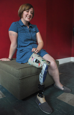 Rarity is something graphic designer Jill Baker knows well. The 32-year old Spring Grove Village resident was born with a congenital birth defect known as proximal focal femoral deficiency (PFFD), a disorder occurring as infrequently as 1 in 200,000 births. This developmental anomaly, characterized by a shortened or absent femur (thigh bone), is most often associated with children whose mothers took the drug Thalidomide during pregnancy. Baker’s mother did not, making her case exceptionally rare. As Baker smilingly points out, “I guess I was just one of the lucky ones.”