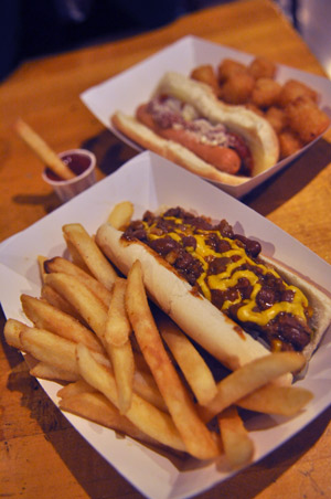 Forste and company have designed sixteen specialty hot dogs, but initially will offer four or five at a time. All dogs are served with french fries or tater tots. Rose’s homemade vegan chili, an optional addition free of charge, has sold out every night since they opened. Other toppings include pizza sauce, cole slaw, dill pickle spears, chopped onions, pepperoni and bacon. The beef dogs cost $4.50 and the Raw Dog, a vegan option, $5.00.