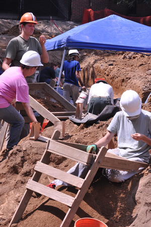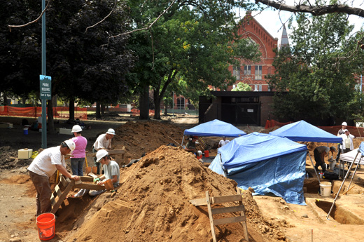 All told, it’s looking like 18 months to the finish line, and excavation has just now begun. Peering over the fence last week, the scene looked like a mini-Indiana Jones dig, as archeological consultants from Gray & Pape sifted dirt and dug meticulous little, tent-covered trenches so as to carefully disinter and catalog whatever remains still lie in the ground from the park’s former use as a cemetery. Back in 1855, city officials were worried that “miasmas” – vapors rising from the corpses – were a public health menace, so they bought the land for the park and moved the bodies to Spring Grove Cemetery. Obviously, they missed a few bodies, as workers were uncovering parts of a toe, hand, foot, and…as of Thursday, a skull and rib cage. We can only hope no miasmas were released in the process.