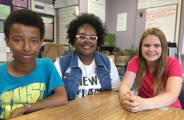 Seventh- and eighth-grade students are divided into four “communities” of 50 to 60 each and assigned a team of teachers. Students chose the names and created and selected logos within their communities. Taylor heads up United Leaders, with two teaching partners.