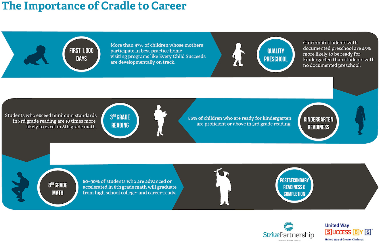 StrivePartnership’s cradle-to-career strategy is rooted in the belief that education is an absolutely essential engine of economic growth and individual success. Its programs seek to ensure that every child is prepared for school, is supported inside and outside of school, succeeds academically, enrolls in some form of post-secondary education and graduates to enter a meaningful career.