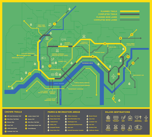 CROWN, a series of trails that loops and connects Cincinnati's existing biking and walking trails, is underway. Forty-eight miles of the planned 104-mile network already exist.