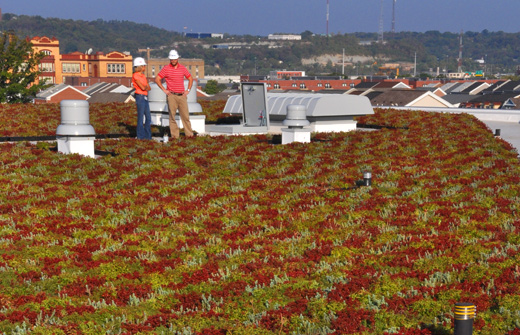 Not long ago, spotting vegetation on the roof of a building in Cincinnati was a sure sign of urban decay. If a building was so neglected that plants were taking root in the dirt on its flat surfaces, one could reason, it wouldn’t be long before wind, snow or a wrecking ball brought the roof down on the place. But now, roofs are sprouting green throughout the city. And people aren’t shaking their heads in dismay or calling in the demolition teams – in fact, they’re praising the spread of a very visible, and often beautiful, environmentally conscious technology.