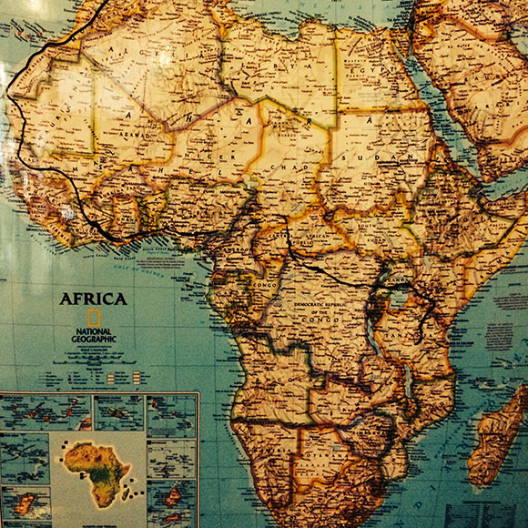 When I was younger my family used to cross Africa. That map behind you is the route, starting in Morocco and going all the way through. The problem is, recently it’s been (stands to explain on the map) the whole of this portion of Africa has been cut off— centrally—since the early ‘90s. Just been war zones one way or another. So you couldn’t actually drive through.