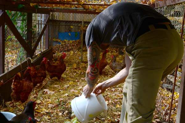 This urban farmer’s 6-year-old daughter, Simone, helps tend to the chickens as well, learning age-old lessons of responsibility without having to squeeze up piles of poo with a plastic bag (or stink up a pair of shoes and the Lamkin living room).