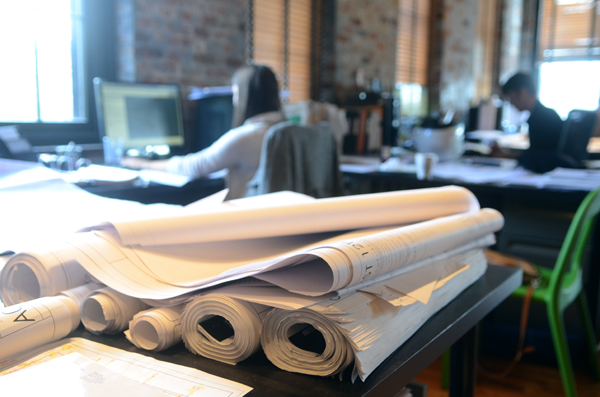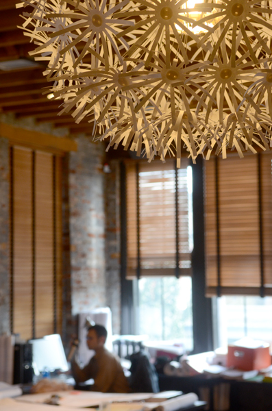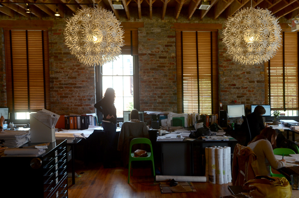 Light streams into the top floor of their East 14th Street space, where wood beams, exposed brick and ductwork and orange accents warm the cubicle-free, 2,500-square-foot space. As the business’ name implies, the architects run their firm a lot like a communal architecture studio. Nine employees spread their work across two tables each. Bikes lean against walls; a modern open kitchen includes a rack of different flavored coffees from which to choose. A foosball table sits in the back of the space, next to a table for impromptu meetings, though Heil and Noble admit that there’s not a lot of time for recreation these days.