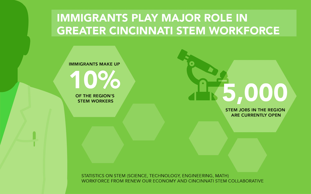 In Greater Cincinnati, they already constitute 10 percent of STEM workers, prepared for employment in the fields of science, technology, engineering and mathematics. They’re a resource with tremendous potential for local growth: In the 2000 U.S. Census, about a quarter of all STEM workers in America were immigrants with college degrees or higher; about half of them held doctorate degrees.