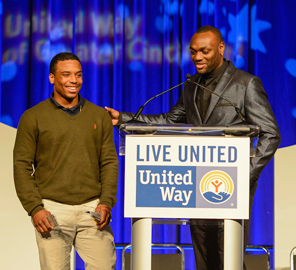 Provided – Terence Daniels and Terrell Blue of Big Brothers, Big Sisters of Cincinnati present the corporate heroes award.