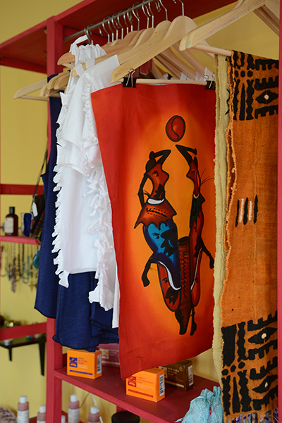 Other merchandise includes hematite necklaces, dangly, one-of-a-kind earrings by CoaCoa Goddess, Sheba Mama’s handmade shea butter “whips,” business card holders made from a soft synthetic fabric from Thailand and bangle bracelets from India.