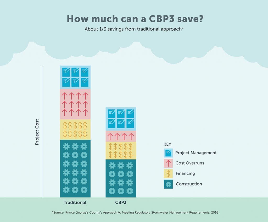 The Clean Water Partnership is a Community-Based Public-Private Partnership (CBP3) between the county and Corvias Solutions. Through the 30-year agreement, Corvias executes and performs the finance, design, construction, operation and maintenance of Prince George’s County’s stormwater management programs. This means an entirely new approach to building new infrastructure — one that looks beyond water to solving additional challenges identified in the community.