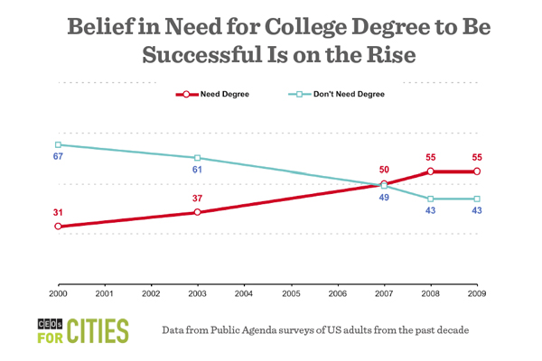 In the end, “education gains are a product of shift in entire skill distribution – not just moving a certain number of people from no degree to college graduation,” says Cortright. Any gain is good and while three years is a short time, it’s a good start.