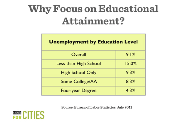 “The best way to measure the economic success of a city is per capita income and the simple most direct connection of per capita income is college attainment,” says Lee Fisher, president of CEOs for Cities, a civic lab and network of urban leaders across the country.