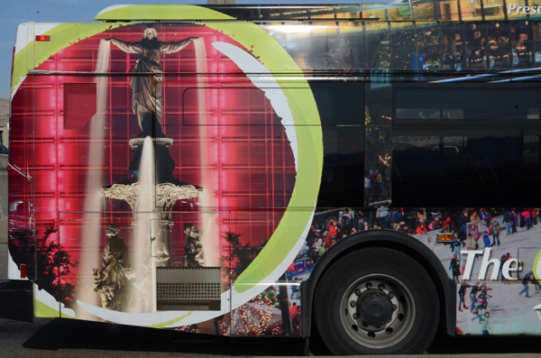 A segment from one of the Cincinnati Art Museum’s treasures, Vincent van Gogh’s Undergrowth with Two Figures, flows over a side of one bus, while on the other side we see a view of the Contemporary Arts Center’s Shepard Fairey exhibition. Krohn Conservatory, represented by an iridescent blue butterfly, shares a bus with Fountain Square’s ice skating rink and, of course, a view of the fountain itself. The handsome profile of a string instrument recalls Music Hall, accompanied by the National Underground Railroad Freedom Center’s lighted candle on the opposite side. Figures from the Cincinnati Museum Center’s famous murals are on the fourth bus, which they share with representatives of the Cincinnati Zoo. The gorilla, polar bear and elephant all could be seen as seated on the bus. Several pieces of bus art include facades of the buildings housing the city-defining attractions.