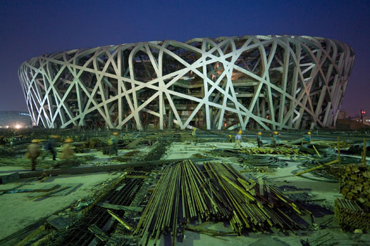 Beijing National Stadium stands wrapped in a seemingly haphazard mesh of steel beams, in a shape that vaguely resembles a colossal robin’s nest.
